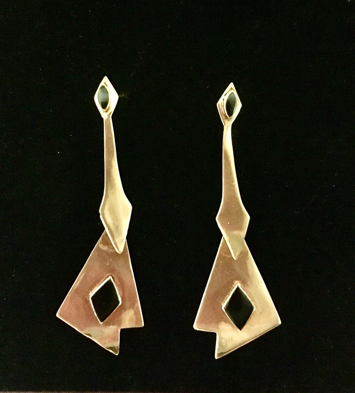 These rare 1980s earrings embody the bold spirit of the Art Deco Revival era, where geometry, motion, and symbolism converged into powerful adornment. Crafted from solid bronze, each earring is set with a striking diamond-shaped onyx inlay, a stone long associated with protection, grounding, and inner strength. The elongated silhouette tapers into a sculptural form, while the angular lower section features a cut-out diamond that mirrors the stone above, creating both visual rhythm and a sense of dynamic movement.