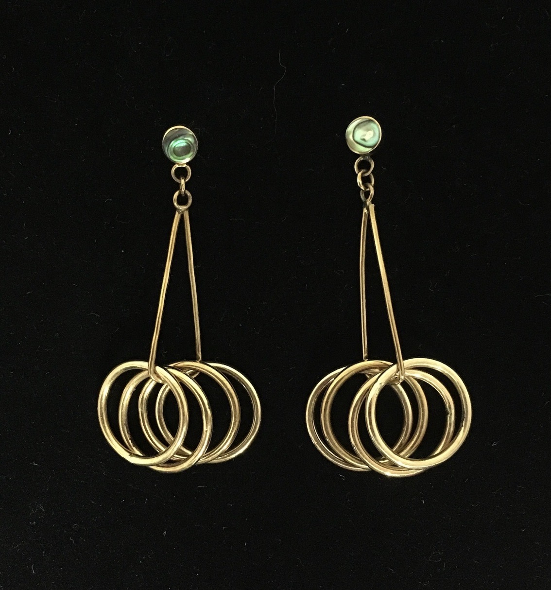 Modernist kinetic bronze earrings with abalone shell studs and interlocking golden rings — a statement of rhythm, balance, and cosmic elegance.