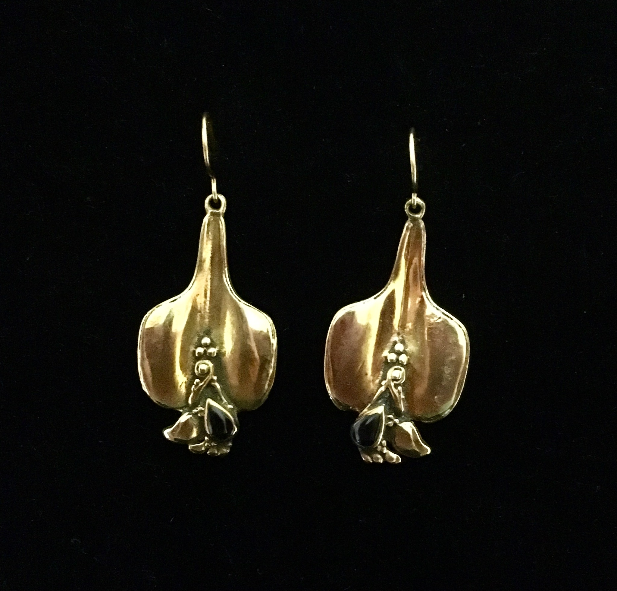 1980s Art Nouveau Revival earrings with onyx teardrop inlay. The deep black gemstone adds mystery and grounding energy to the organic petal design, balancing romance with strength.